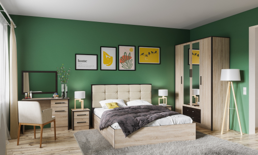 Спальня Лирика (вариант 2) поможет обустроить уютную комнату, где вы сможете отдохнуть не только телом, но и душой. Кровать предоставит достаточно комфортное и широкое спальное место, где вы сможете расслабиться, отдохнуть и набраться сил после трудных дней. Высокое изголовье с мягкой вставкой позволит перед сном расположиться и почитать увлекательную книгу или посмотреть интересный фильм. А прикроватные тумбы помогут держать все важные и необходимые предметы около кровати. За четырьмя распашными дверьми шкафа находится достаточно вместительное пространство, созданное для аккуратного и бережного хранения вашего гардероба. Широкая штанга предназначена для вешалок-плечиков с одеждой, а достаточное количество полок и два выдвижных ящиков - для белья, аксессуаров и коробок с обувью. Туалетный стол вместе с зеркалом создают укромный уголок для нанесения макияжа, создания укладок и подбора удачных украшений. Смелое сочетание цветов и отсутствие лишних декоративных элементов - все это о спальном гарнитуре Лирика.