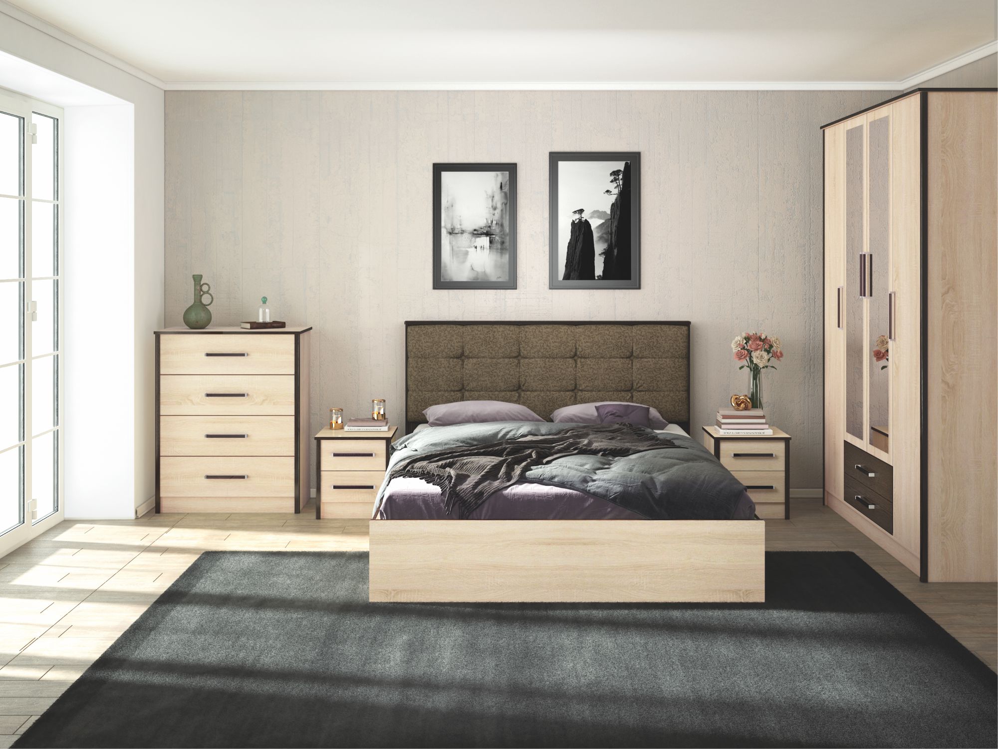 Спальня Лирика (вариант 4) поможет обустроить уютную комнату, где вы сможете отдохнуть не только телом, но и душой. Кровать предоставит достаточно комфортное и широкое спальное место, где вы сможете расслабиться, отдохнуть и набраться сил после трудных дней. Высокое изголовье с мягкой вставкой позволит перед сном расположиться и почитать увлекательную книгу или посмотреть интересный фильм. А прикроватные тумбы помогут держать все важные и необходимые предметы около кровати. За четырьмя распашными дверьми шкафа находится достаточно вместительное пространство, созданное для аккуратного и бережного хранения вашего гардероба. Широкая штанга предназначена для вешалок-плечиков с одеждой, а достаточное количество полок и два выдвижных ящиков - для белья, аксессуаров и коробок с обувью. Зеркала пригодятся во время подбора удачного образа, дополнив его безупречными аксессуарами. Смелое сочетание цветов и отсутствие лишних декоративных элементов - все это о спальном гарнитуре Лирика.