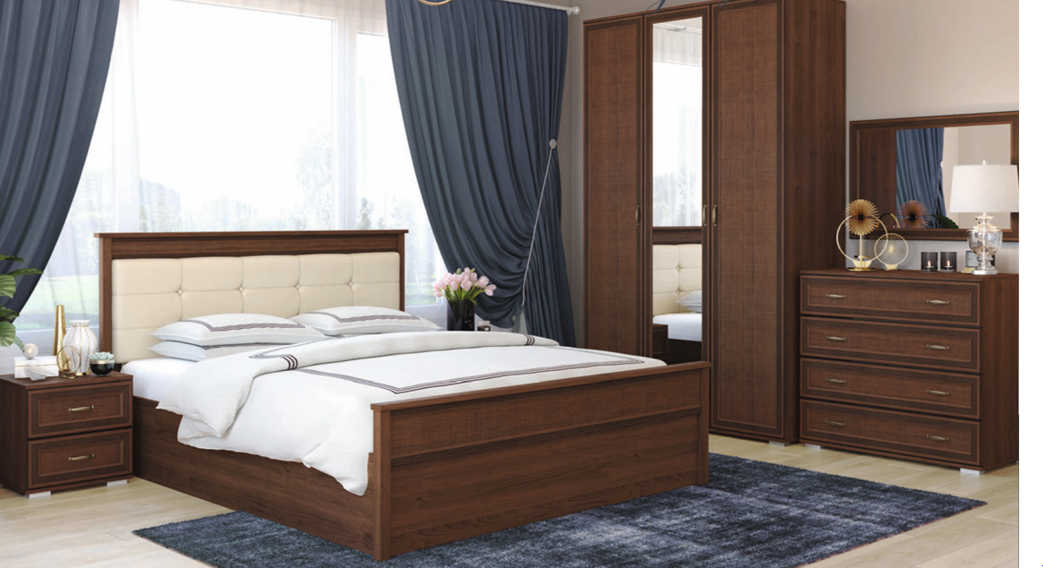 Спальня Ливорно (вариант 1) поможет обустроить уютную комнату, где вы сможете отдохнуть не только телом, но и душой. Кровать предоставит комфортное спальное место где вы сможете отдохнуть, расслабиться и набраться сил. Высокое изголовье позволит расположиться перед сном и почитать интересную книгу, посмотреть фильм или сериал на планшете. Тумба прикроватная поможет разместить около кровати все необходимые предметы. В двух выдвижных ящиках вы сможете хранить книгу для чтения перед сном, маску для сна и крем для увлажнения рук. Сверху на тумбе можно разместить семейную фотографию, небольшой светильник и часы для своевременных подъемов. За распашными дверьми шкафа находится широкая штанга для вешалок-плечиков с верхней одеждой, деловыми костюмами, красивыми платьями и другой безупречно выглаженной одеждой. Полки пригодятся для хранения сложенной одежды, постельного и нижнего белья, различных аксессуаров. Комод с зеркалом создают укромный уголок для наведения красоты и хранения косметики.