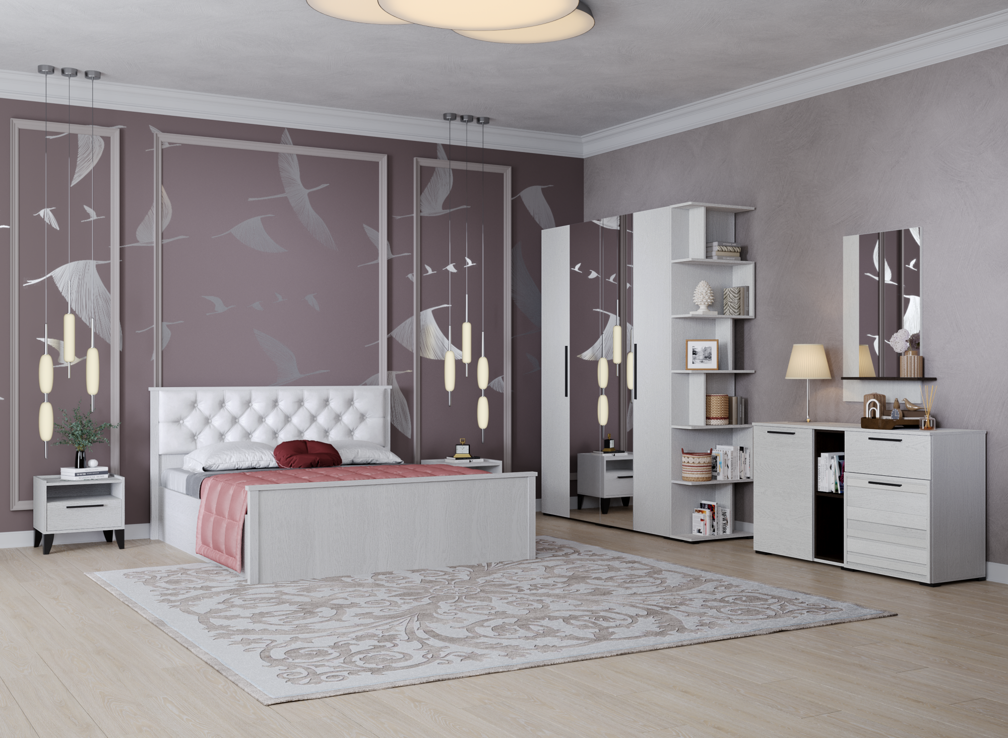 Спальня Модена (вариант 4) поможет обустроить уютную комнату, где вы сможете отдохнуть не только телом, но и душой. Кровать предоставит комфортное спальное место где вы сможете отдохнуть, расслабиться и набраться сил. Высокое мягкое изголовье позволит расположиться перед сном и почитать интересную книгу, посмотреть фильм или сериал на планшете. Тумбы прикроватные помогут разместить около кровати все необходимые предметы. В выдвижных ящиках вы сможете хранить книгу для чтения перед сном, маску для сна и крем для увлажнения рук. За распашными дверьми шкафов находятся штанги для вешалок-плечиков. Полки и выдвижные ящики комода пригодятся для размещения сложенной одежды, постельного и нижнего белья, различных аксессуаров и коробок с обувью. На открытых полках стеллажа будут гармонично смотреться семейные фотографии, интересные книги, небольшие вазоны с цветами, памятные сувениры, необычные статуэтки и оригинальные предметы декора. Мебель Модена - это удивительное сочетание несочетаемого: естественность, но напоказ; отделка, но минимальная; украшения, но тяжеловатые.