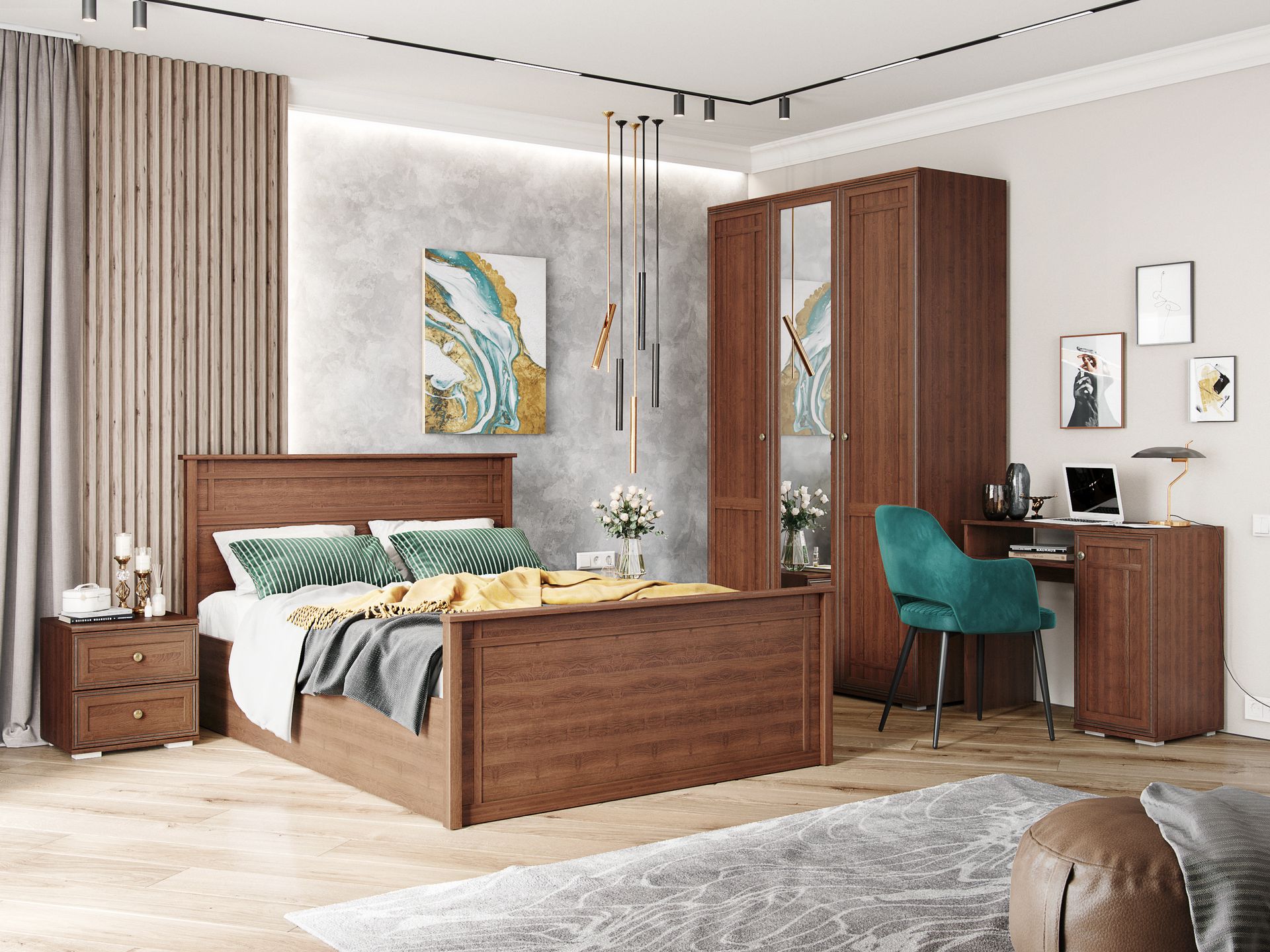 Спальня Ричард (вариант 1) поможет обустроить уютную комнату, где вы сможете отдохнуть не только телом, но и душой. Кровать предоставит комфортное спальное место где вы сможете отдохнуть, расслабиться и набраться сил. Высокое изголовье позволит расположиться перед сном и почитать интересную книгу, посмотреть фильм или сериал на планшете. Тумба прикроватная поможет разместить около кровати все необходимые предметы. В двух выдвижных ящиках вы сможете хранить книгу для чтения перед сном, маску для сна и крем для увлажнения рук. Сверху на тумбе можно разместить семейную фотографию, небольшой светильник и часы для своевременных подъемов. За распашными дверьми шкафа находится широкая штанга для вешалок-плечиков с верхней одеждой, деловыми костюмами, красивыми платьями и другой безупречно выглаженной одеждой. Полки пригодятся для хранения сложенной одежды, постельного и нижнего белья, различных аксессуаров. Косметический стол поможет обустроить комфортный уголок для наведения красоты и хранения косметики.