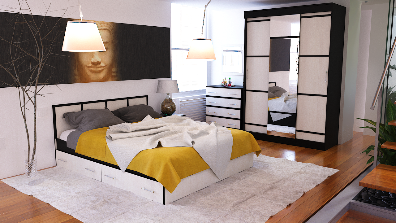 Спальня Сакура (вариант 1) поможет правильно и со вкусом обустроить самую любимую комнату в вашем доме. Кровать предоставит необычайно удобное спальное место, где вы после трудных и насыщенных дней сможете расслабиться, отдохнуть и набраться сил. Два вместительных выдвижных ящика прикроватной тумбы пригодятся для хранения разнообразных и необходимых предметов. На тумбе вы сможете разместить небольшой светильник и несколько красочных семейных фотографий. За раздвижными дверьми шкафа-купе пространство разделено жесткой перегородкой на два автономных отделения. Справа находится широкая штанга для вешалок-плечиков с красивыми платьями, верхней одеждой в чехлах, костюмами и разной выглаженной одеждой. А слева расположены полки, созданные для хранения сложенной одежды, белья, различных аксессуаров и коробок с обувь. Комод с зеркалом создают укромный уголок для наведения красоты и хранения косметики. Мебель Сакура создана для истинных ценителей тонкостей восточной эстетики, с её традиционным практичным уютом и нежной прелестью красоты.
