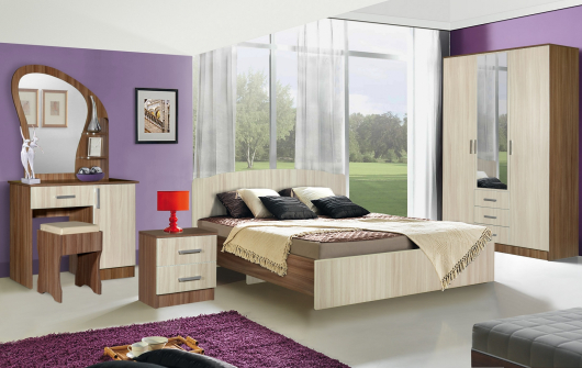 Спальня подходит для комнат от 14 м² — удобно разместить всё в ряд или по диагонали. Стол макияжный с банкеткой удобно использовать и как дополнительное сидение при уборке, и как место для хранения белья или книг. Зеркало в шкафу помогает оценить образ целиком — идеально при подготовке к выходу. Фигура спинки кровати не только украшает интерьер, но и защищает матрас от пыли. Прикроватные тумбы на одной высоте — легко выравнивать освещение, ставить одинаковые лампы. Выбор из четырёх оттенков ЛДСП: «венге» добавит глубины, «дуб молочный» — свежести, «ясень шимо» — тепла. Подойдёт и для классического, и для современного интерьера.