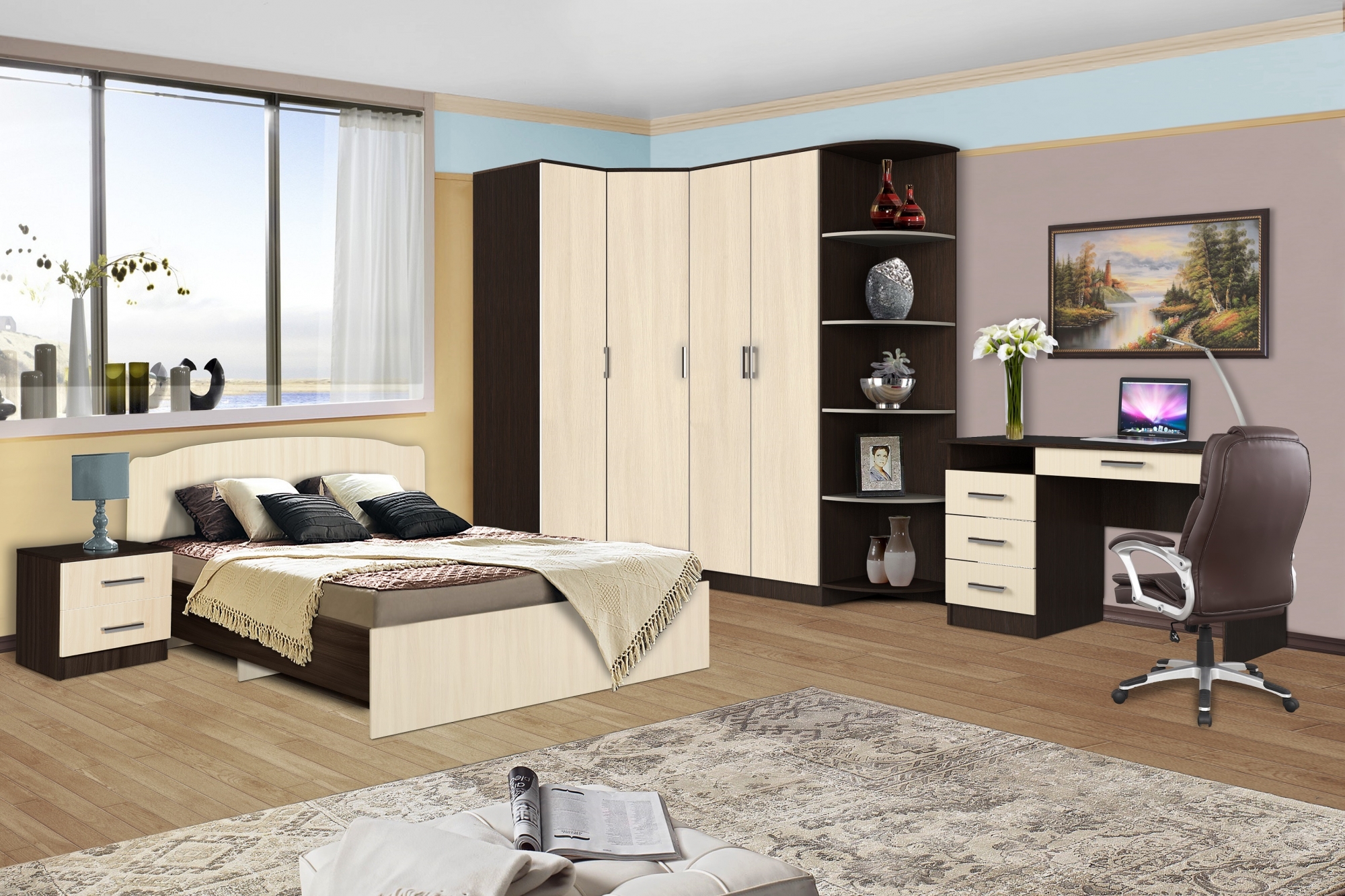 Эта спальня хорошо вписывается в небольшие комнаты благодаря продуманной организации пространства: угловой шкаф и стеллаж эффективно используют площадь без перегрузки. Угловые элементы особенно уместны в студиях или однокомнатных квартирах, где важно максимизировать хранение. Плоские фасады из ЛДСП не требуют частого ухода, а стандартные размеры позволяют легко подобрать матрас и постельное бельё. Для пары, ценящей порядок, двухстворчатый платяной шкаф обеспечит удобное размещение одежды, а прикроватные тумбы — доступ к мелочам без лишних движений. Такая конфигурация подойдёт тем, кто ищет баланс между функциональностью и минимализмом в интерьере.