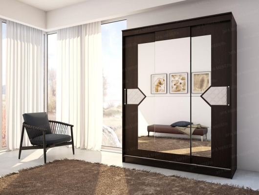 Наполнение: отделение со штангой и полкой, отделение с полками, отделение со штангой и полкой.Три дверцы с зеркальным покрытием не только визуально расширяют пространство, но и удобны для утреннего выбора образа — достаточно открыть одну из них, чтобы оценить комплект одежды в полном росте. Благодаря глубине 590 мм шкаф легко вместит сезонную одежду на вешалках и коробки с вещами, не загромождая проход. Отделение со штангой под одеждой на плечиках отделено от полочного — это удобно при переезде или планировании гардероба на неделю. При ширине 1700 мм он занимает место стандартного двухместного дивана, но работает как полноценный модуль хранения для спальни площадью от 12 м². Зеркальные панели на всех дверях создают эффект симметрии и помогают оценить интерьер с разных ракурсов.